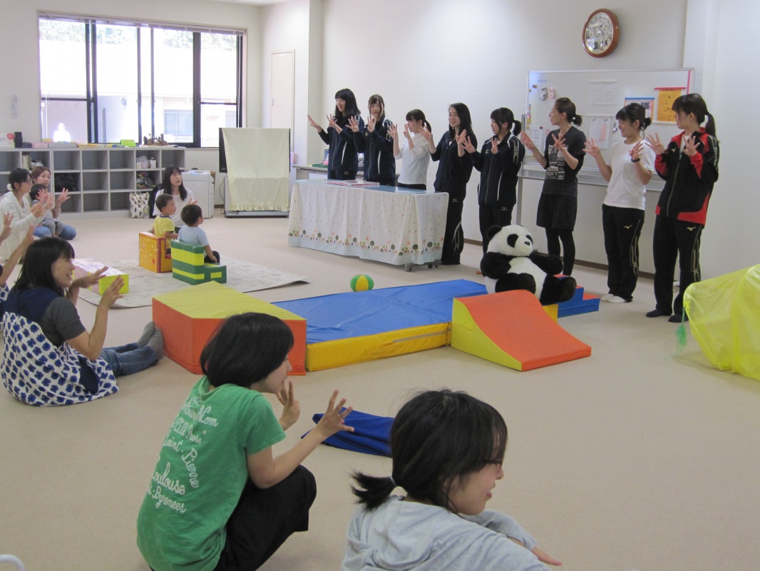 福祉ゼミでは、「地域子育て支援拠点事業」として実施されている宇多津町公設「つどいの広場事業 はぐはぐランドうたづ」へ行き、0歳から3歳の乳幼児や保護者の方と交流しています。