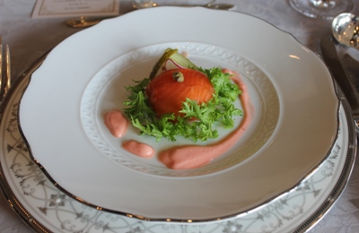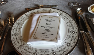 前菜:スモークサーモンのポーピエット、スープ:茸のクリームスープ カプチーノ仕立て、魚料理:鱈のシャンパン蒸し、肉料理:豚ロース肉のピカタ、デザート:アールグレイ紅茶のムース
