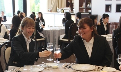 参加した学生はテーブルマナーとしてフォークやナイフの使い方やナプキンの使い方など基本的なところから細かいところまで、スタッフの方の丁寧なご指導のおかげで楽しみながら、テーブルマナーについて学びました。代表の学生に乾杯の音頭を取ってもらい、フルコースを体験しました。学生の中には初めてフルコースを体験した学生もおり、「少し緊張したけど、彩りや盛り付けがきれいでおいしかった。」などと話してくれました。