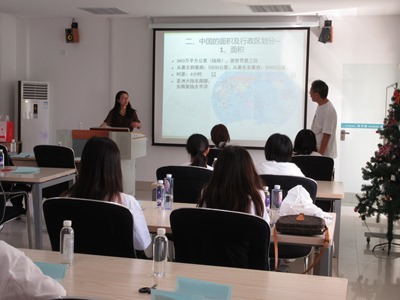 まずはじめに、中国の概況についての講義を受けました。中国の地理、領土、観光地、文化、京劇、少林寺拳法、太極拳、中国画、教育、四大発明、祝祭日などについての説明がありました。