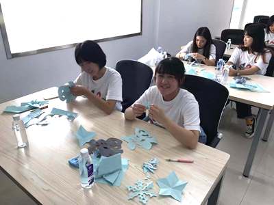 その後、中国で二千年の歴史のある切り紙(剪紙)について簡単に学んだ後、実際に星や雪の結晶、文字の切り抜きに挑戦しました。中国ではこの切り紙を壁や窓、提灯などに貼り付けるそうです。