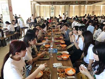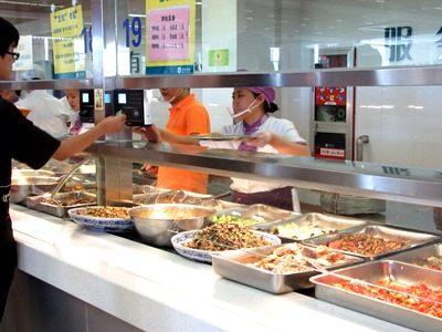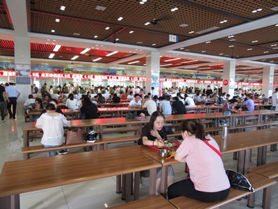 昼食は、学生食堂「江南苑」に行きました。銘々に食べたいものを好きなだけ注文して、その都度、お金がチャージされているカードで支払いを行いました。もっとも高価なメニューでも6元(約100円)とかなりリーズナブルで、ボリュームがあり、品数も豊富でした。とても広い食堂ですが、江南大学には学生が3万人も在籍しているため、すぐに席がいっぱいになっていました。学生食堂は全部で4施設あるそうです。