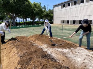 運動場の隅に運び入れた土にバーク堆肥240ℓと蛎殻有機石灰を混ぜ込み、幅1m×長さ6m×高さ0.3mの畝を2つ作りました。幅は0.6m位が良かったのですが広くなってしまいました。