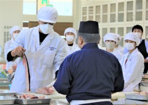 最初に、香川県水産課・岡田侑樹氏による「香川の水産物について」の講話を受け、続いて、調理実習を行いました。まず、海鮮料理店店主・友澤敏雄氏の指導のもとハマチのさばき方を教わりました。学生たちは大きなぶりやハマチを興味深く観察し、友澤氏の見事な包丁さばきをお手本に真剣な表情で魚をさばいていました。体験した学生が、友澤氏より「包丁の持ち方や、手つきが良いですね。」とお褒めの言葉をいただく一面もありま