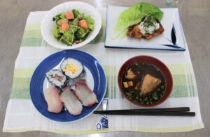 した。さらに、さばいた魚と県産のりを使って3メートルのジャンボ巻きずし、友澤氏の実演を交えながらオリーブぶりのにんにくステーキ、讃岐さーもんとオリーブハマチのサラダ、オリーブハマチの握り、オリーブハマチのあらの赤出汁の実習が行われ、「県産ブランド魚を使った献立」が完成しました。