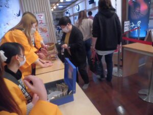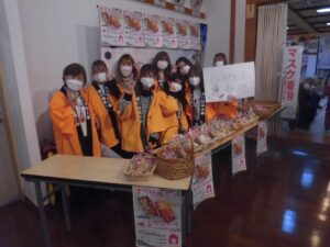 令和5年2月11日(土)、新宇多津都市にある四国健康村(有限会社 萩原総業)で食物栄養専攻調理&商品開発ゼミ学生8名が、ゼミで考案した希少糖、柿の葉の粉茶を入れたヨーグルトケーキを作り販売しました。販売にあたり、地元で開発された希少糖(一般社団法人希少糖普及協会)や柿の葉粉末(柿茶本舗有限会社)の機能性を説明し、ヨーグルトケーキの特徴について、プレゼンテーションしたところ、多くの来場者の方達が熱心に聞いていました。