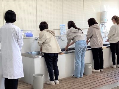 食事提供や食品製造など食に関わる栄養士にとって、手洗いは食中毒予防、感染症予防など衛生管理の観点からも大変重要です。それらを意識してもらうため、令和4年度より、入学直後の前期オリエンテーションに取り入れています。