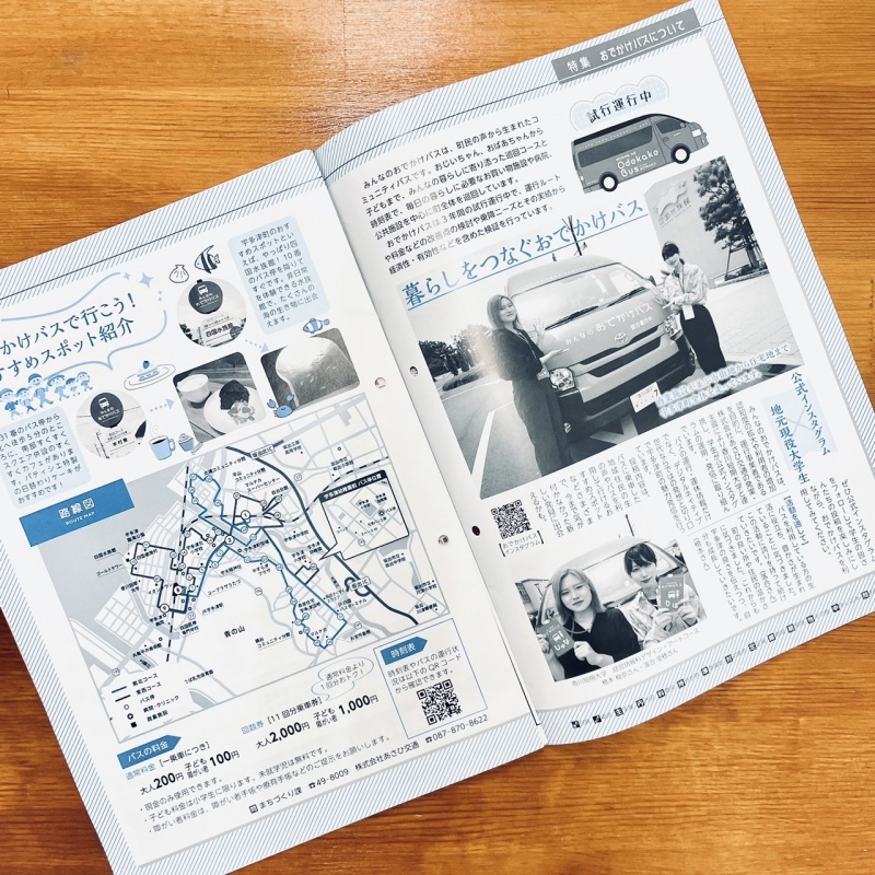 広報うたづ7月号にみんなのおでかけバス広報活動掲載 経営情報科 2023年7月20日 SNSでシェアする デザイン・アートコースで2022年12月より広報活動を担当させていただいている、宇多津町の「みんなのおでかけバス」について、学生のこれまでの取組みを「広報うたづ7月号」にて掲載していただきました。宇多津町にお住まいの方はぜひ手に取ってみてください。