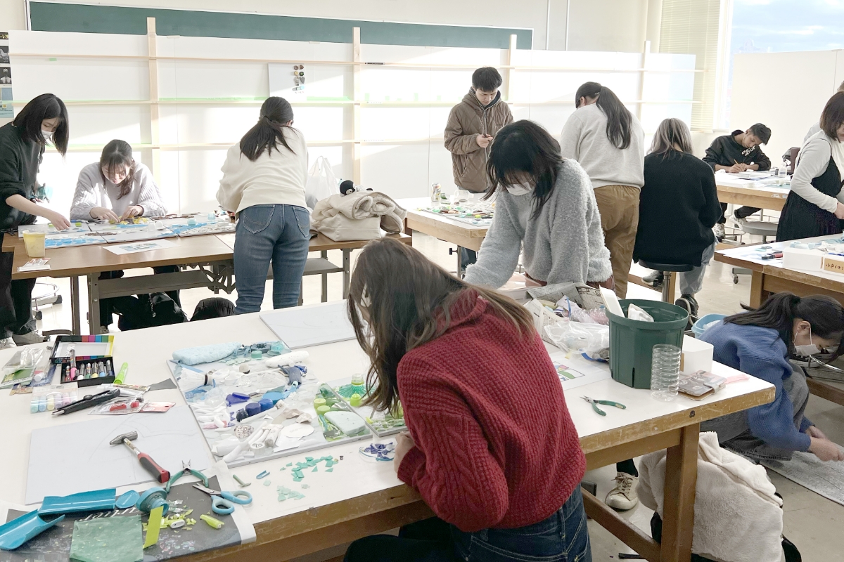 下記休暇中の約2週間。隔年開催で2単位取得できます。このプログラムはデザインアートコースの学生のために用意された特別なプログラムです。滞在中は慣れない英語でのコミュニケーションに最初は戸惑いますが、作品制作を重ねるうちに現地大学の先生たちが伝えてくれる意味が分かり始めます。これまで3名が本学卒業後に編入学し、イギリスで学位を取得しています。コロナ禍だった2021年度はオンラインで研修が開催されました。