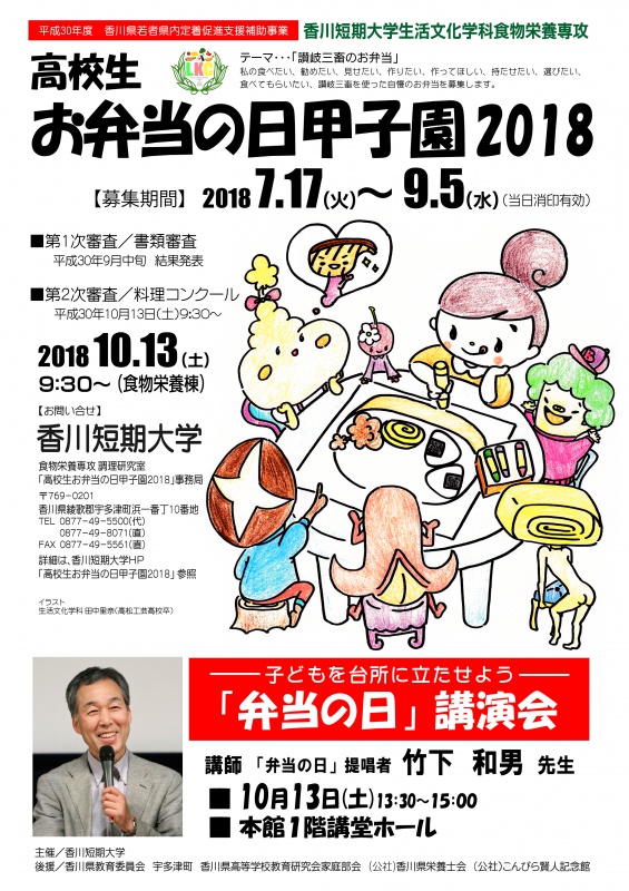 香川短期大学生活文化学科食物栄養専攻では平成30年度香川県若者県内定着促進支援補助事業の一環として、香川短期大学「高校生お弁当の日甲子園2018」を開催します。