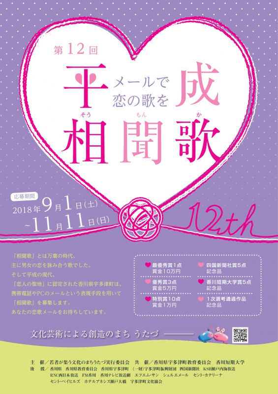 宇多津町教育委員会、香川短期大学などで組織する「若者が集う文化の町うたづ実行委員会」(会長・石川浩香川短期大学学長)主催の「第12回平成相聞歌 メールで恋の歌を」の作品募集がスタートしました。皆さまからのたくさんの応募をお待ちしています。