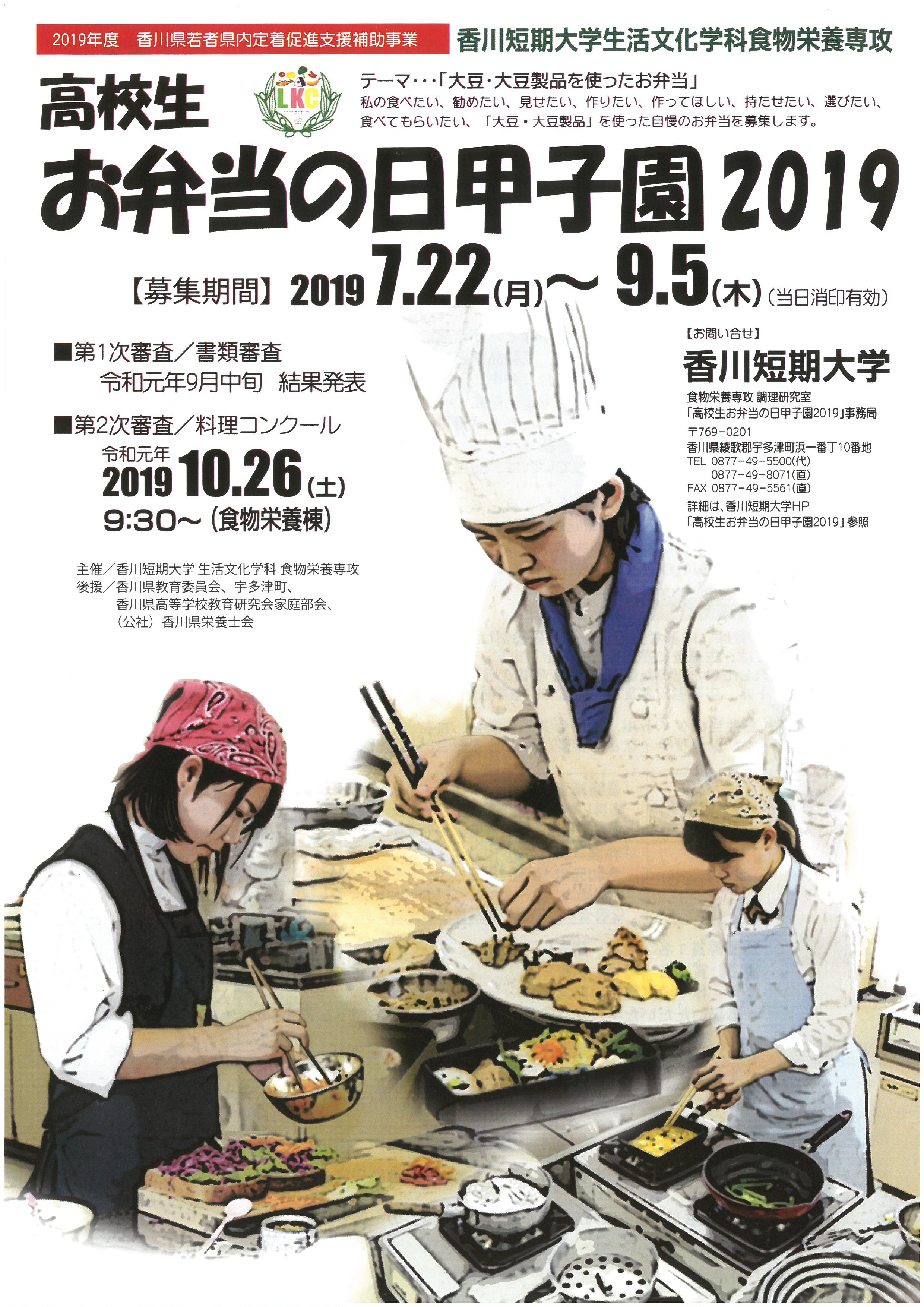 香川短期大学生活文化学科食物栄養専攻では2019年度香川県若者県内定着促進支援補助事業の一環として、香川短期大学「高校生お弁当の日甲子園2019」を開催します。