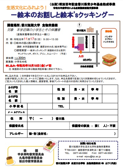 生活文化学科食物栄養専攻では、平成23年度から公益財団法人明治百年記念香川県青少年基金の助成を受け、学生による企画提案活動支援事業を実施しています。今年は、その第9弾として「生活文化にふれよう!」をメーンテーマに絵本のお話しとその中に出てくる料理の調理実習を行います。多くの皆様の参加をお待ちしています。