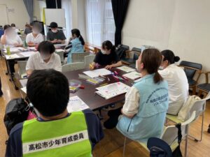 研修会には本学以外に香川大学や穴吹医療大学校の学生およそ20名が参加し、防犯団体「松島地区青色防犯パトロール隊」の方たちがお手伝いしてくれました。