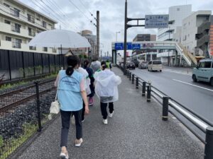 徒歩グループでは、下から見えにくい歩道橋の上や、樹木で視界を遮られた公園などの危険箇所について、パトロール隊の方から説明を受けながら40分程度歩き、研修会を終えました。