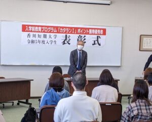 令和5年4月11日(火)、香川短期大学の入学前教育の一つであるeラーニングプログラム「カタランⅠ」の最優秀者1名、優秀者3名、優良者10名の表彰式を行いました。