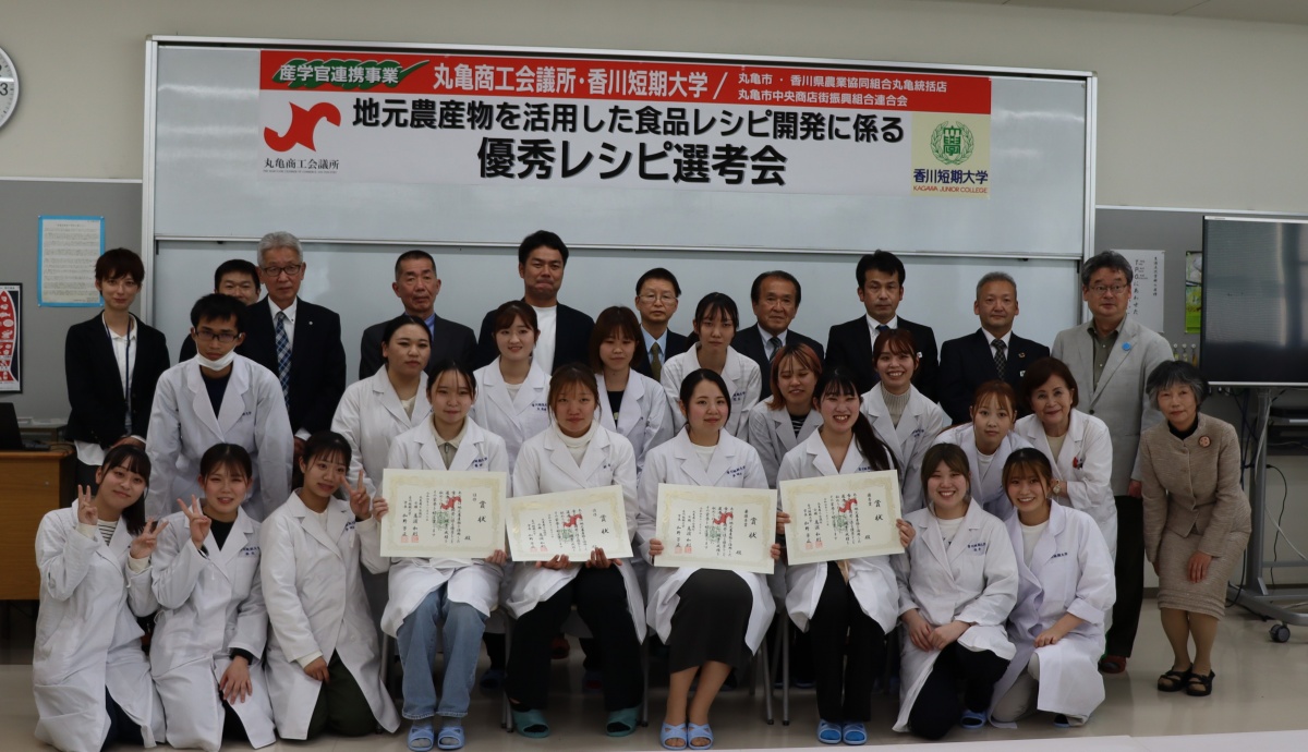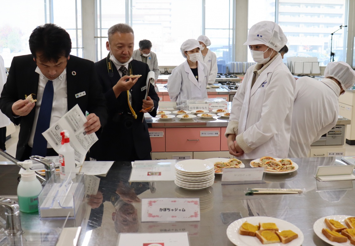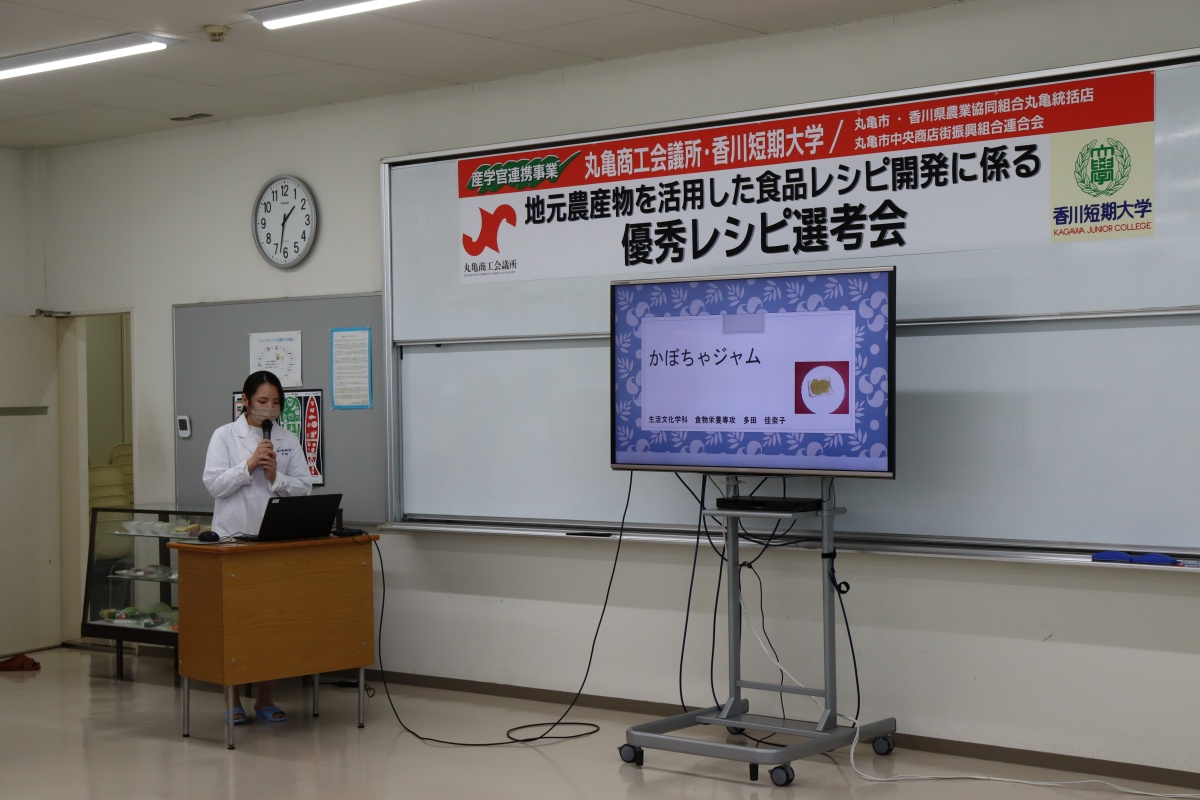 この取組みは本学が丸亀商工会議所、香川県農業協同組合丸亀統括店と連携し食物栄養専攻の学生が形や大きさが規格外で市場に流通できない地元の農産物を用いて家庭で楽しめる新たな食品レシピ等の開発に取り組むことで地元農産物のPRや食品ロスの削減、地産地消の促進に加え、コロナ渦におけるストレス軽減や健康問題といった社会的課題の解決を目指すことが目的です。レシピ選考会では松永ゼミ生13人が考案したレシピを実際に調理し、審査員10人による審査の結果、最優秀賞に多田佳奈子さんの「かぼちゃジャム」、優秀賞に田村有律紗さんの「野菜の皮ごときんぴら」、佳作に藤田蘭世さんの「ぎょうざピザ」、中條ひなたさんの「アスパラベーコンパイ」が選ばれました。