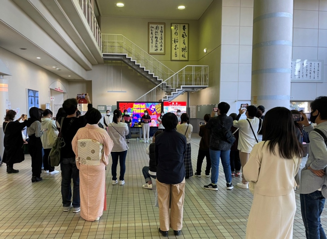 各ゼミやクラス等により、大学祭恒例の模擬店や作品展示、ワークショップの他、ミニこども劇場や演劇など子ども向けのイベントもあり、終日賑わいを見せました。また、メイン企画ではデジタルスタンプラリーが開催され、設定されたチェックポイント全9カ所を巡り、スマートフォンでスタンプを全て集めると、抽選で素敵なプレゼントが当たるので、多くの高校生や学生が参加し学内を広く巡っていました。