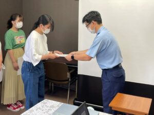 委嘱を受けたのは今年ボランティア同好会に入部した1年生5名のうち希望した学生3名です。交付式では坂出警察署の松岡生活安全課長から一人ひとりに委嘱状が手渡され、「少年の検挙件数は減っているが、SNSを起因とした犯罪は増加傾向にある。補導活動・啓発活動でご協力をお願いする。また、警察はながら見守りを推奨しており、通学や買い物の途中で周りにいる子どもたちを気に掛けてほしい。」とボランティア学生へ期待と激励の言葉がありました。