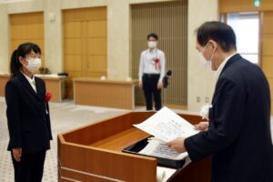令和3年7月2日(金)、県庁特別会議室において令和3年度青少年育成香川県民会議青少年善行者(団体)表彰式が行われ、香川短期大学ボランティア同好会が表彰されました。会長である浜田恵造 香川県知事から、代表学生(子ども学科第Ⅰ部2年 香西さくら子さん)に表彰状が授与されました。