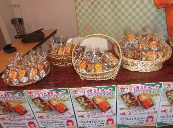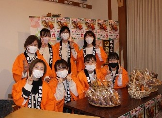 令和4年3月13日(日)、新宇多津都市にある四国健康村(有限会社 萩原総業)で食物栄養専攻調理&商品開発ゼミ学生6名が、ゼミで考案した希少糖、柿の葉の粉茶を入れたヨーグルトケーキを作り販売しました。販売にあたり、地元で開発された希少糖(一般社団法人希少糖普及協会)や柿の葉粉末(柿茶本舗有限会社)の機能性を説明し、ヨーグルトケーキの特徴について、プレゼンテーションしたところ、多くの来場者の方達が熱心に聞いていました。