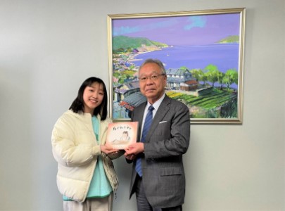 この絵本の読み聞かせ活動を通して命の大切さを伝え、がん検診啓発活動に繋げたいという強い思いがあり、イラストレーターさんに依頼をしてあらためて絵本をきちんとカタチにしたい!と、クラウドファンディングに挑戦し、この度完成した絵本を手に学長室を訪れ、手渡しました。
