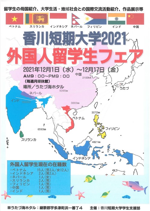 香川短期大学2021外国人留学生フェア イベント 2021年12月3日 SNSでシェアする 香川短期大学外国人留学生の母国紹介や大学生活および地域社会との国際交流活動の写真、留学生が制作した作品等の展示をしています。 期間:12月1日(水)~12月17日(金)(月曜日休館) 時間:午前9時~午後9時 場所:うたづ海ホタル(宇多津町浜一番丁4)