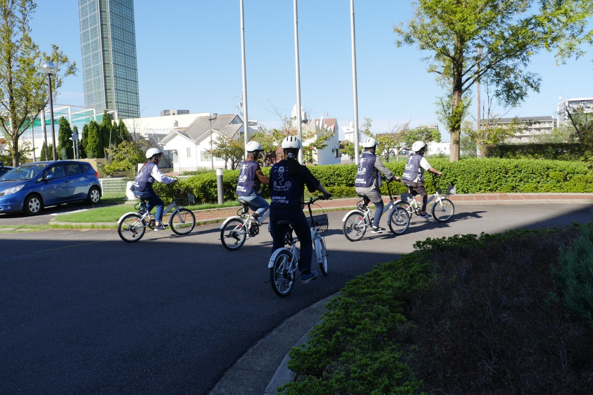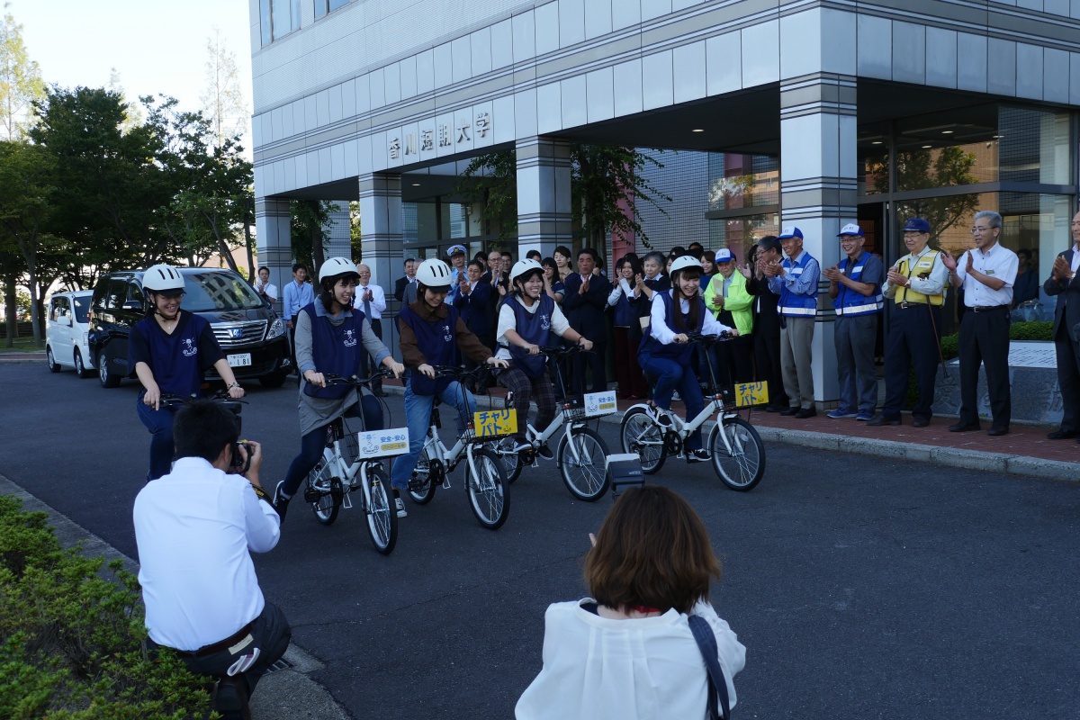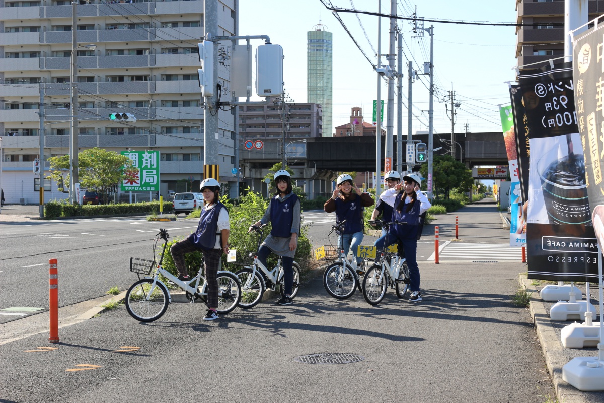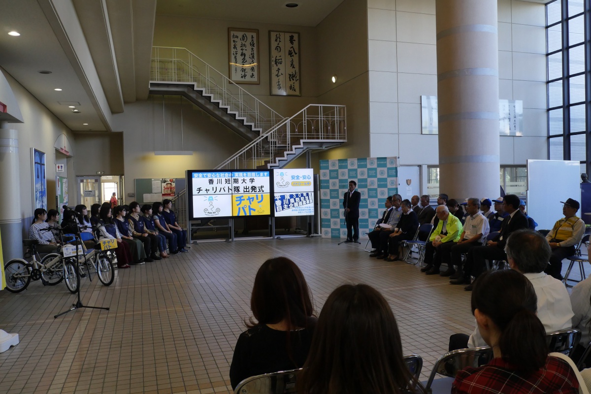 本学ボランティア同好会がチャリパト隊を結成し、9月28日(金)に本学エントランスホールにて出発式を挙行しました。