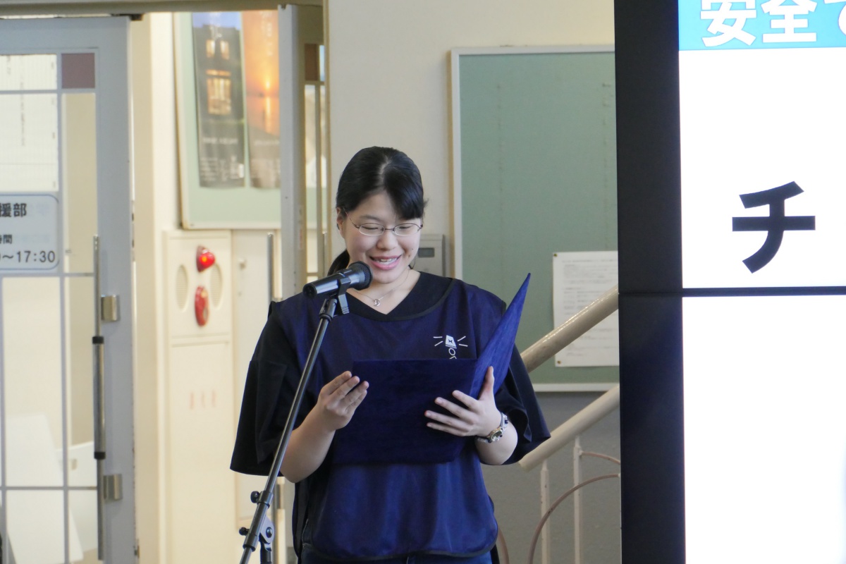ボランティア同好会代表の食物栄養専攻2年横田さんが、「これまでの防犯活動に加えてチャリパト活動を定着させ、地域の人たちと一緒に、安全で安心して暮らせる街をつくることを目標として頑張っていきます。」と力強く決意表明をしました。