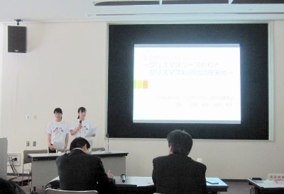 同事業へは、生活文化学科生活文化専攻と食物栄養専攻の有志で8年前より始められ、大きな成果を収めています。昨年度からは子ども学科の学生とのコラボで製作活動と調理実習という取組みを行っています。今年度の報告会には、代表として尾野友香さん、大石紗也香さんの2人が参加、「生活文化にふれよう-クリスマスリース作りとクリスマス料理の調理実習‐」の事業名でプレゼン発表しました。県内の大学や専門学校、高等学校から16の団体が発表を行いました。8分間のプレゼン発表の後の質疑応答では、理事の方からの鋭い質問にも落ち着いて回答することができ、無事発表を終えました。そして、7月22日付の支援事業助成金交付決定通知書が届きました。