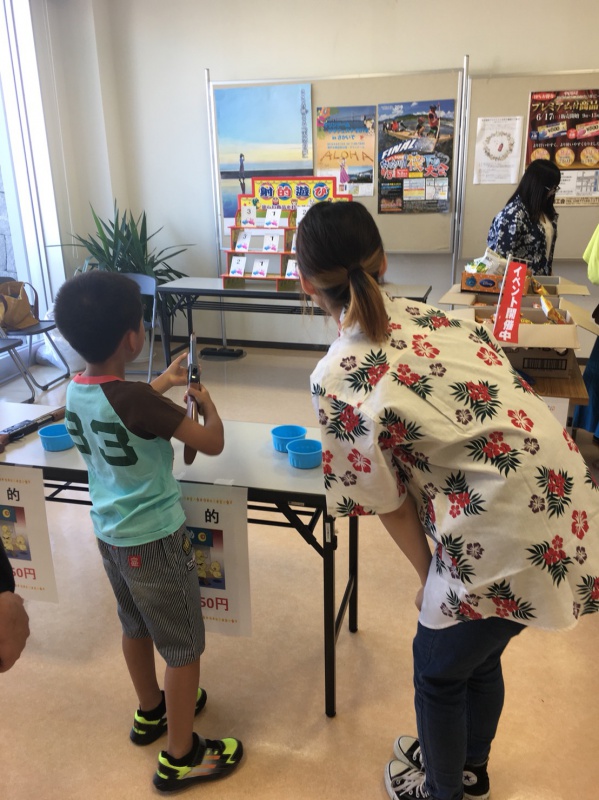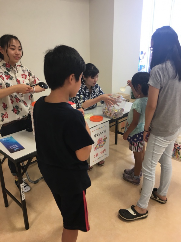 アロハシャツ姿で子どもたちに大人気のゲームコーナーの運営やご当地キャラ「うーみん&ゆーみん&なーみん」の着ぐるみを担当しました。アロハダンスチームが過去最多となるなど、年々盛り上がる会場には多くの家族連れが訪れ、学生たちはほぼ休憩なしでしたが、笑顔で子どもたちに声援を送っていました。