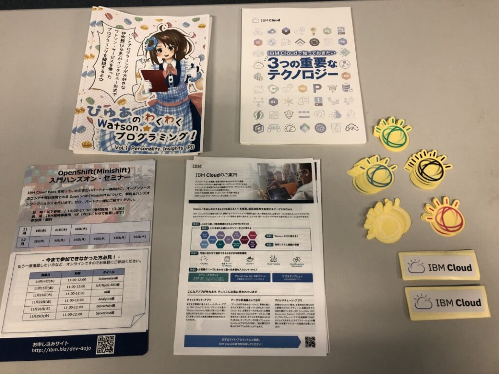 講義開始前に講師より参考パンフレットやIBM Cloudのロゴシールなどのプレゼント